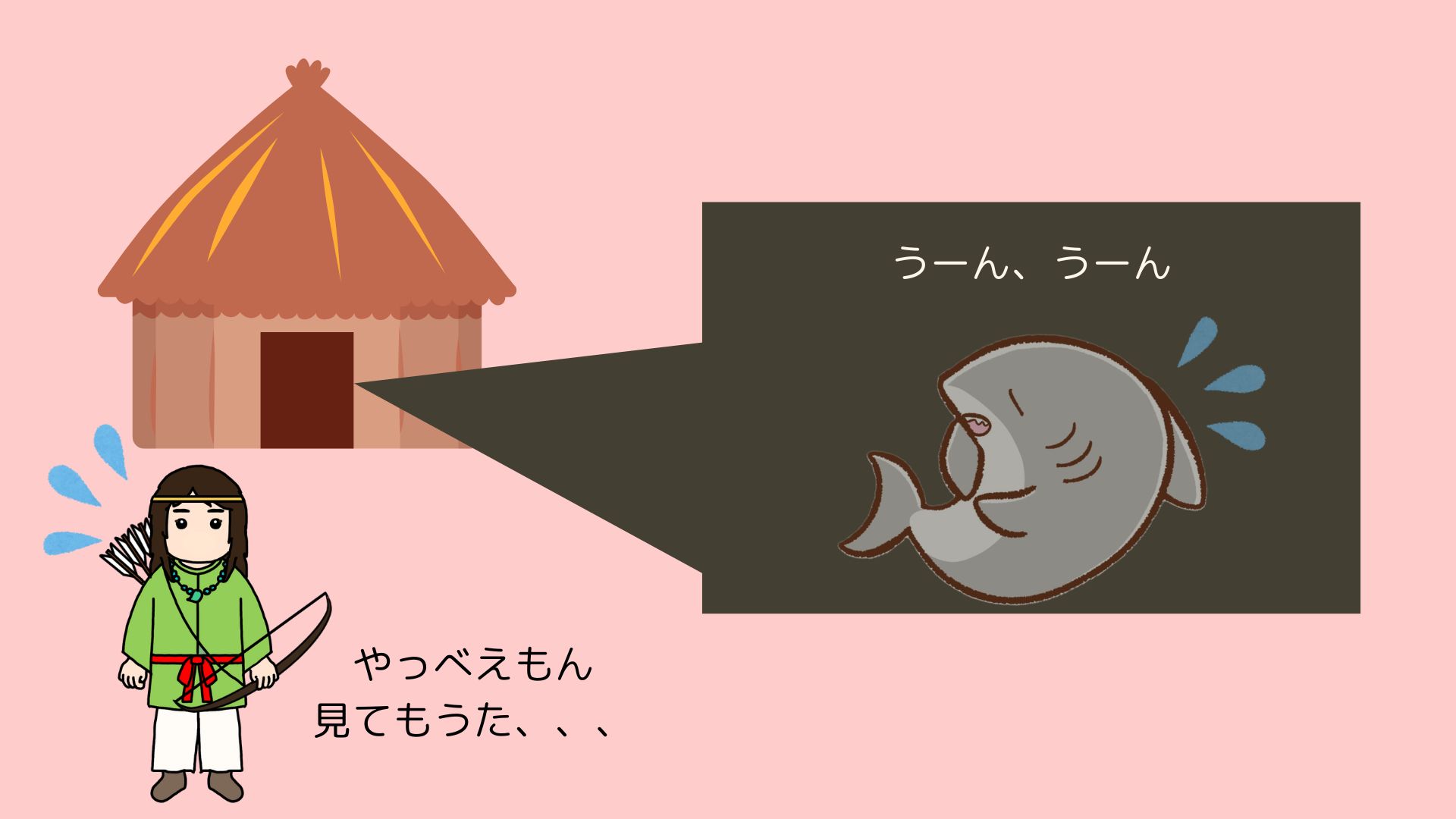 山幸は、日本の昔話の定番通り、我慢できずに扉を開けると、そこにはサメが横たわっていました。